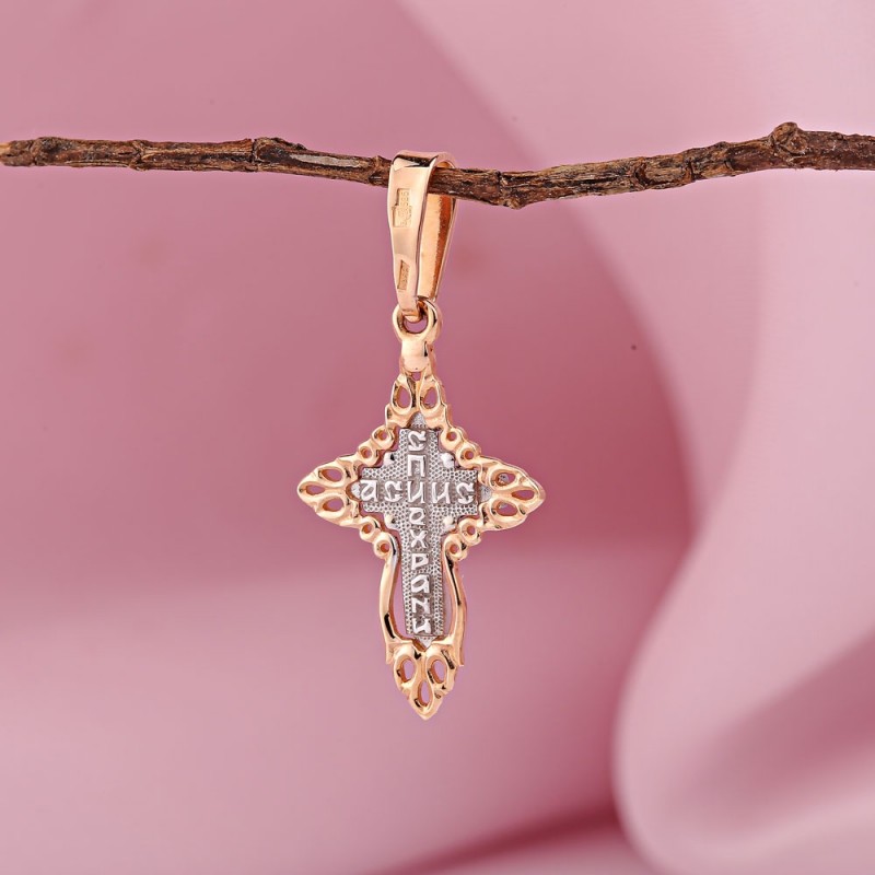 Rotgold, verziert mit einem Kruzifix auf einem Hintergrund aus 585-er Weißgold. Auf der Rückseite ist das Gebet eingraviert: „Rette und bewahre.“