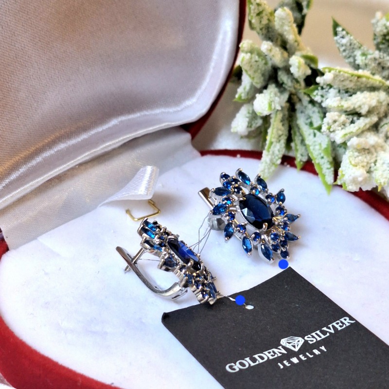 Zarte und romantische Ohrringe sind aus 925er Silber gefertigt, verziert mit bezaubernden dunklelblauen funkelnden Zirkonia verschiedener Größe und Form! Diese Ohrringe strahlen Chic und Unwiderstehlichkeit aus. Mit ihnen werden Sie in jedem Outfit attraktiv sein!
