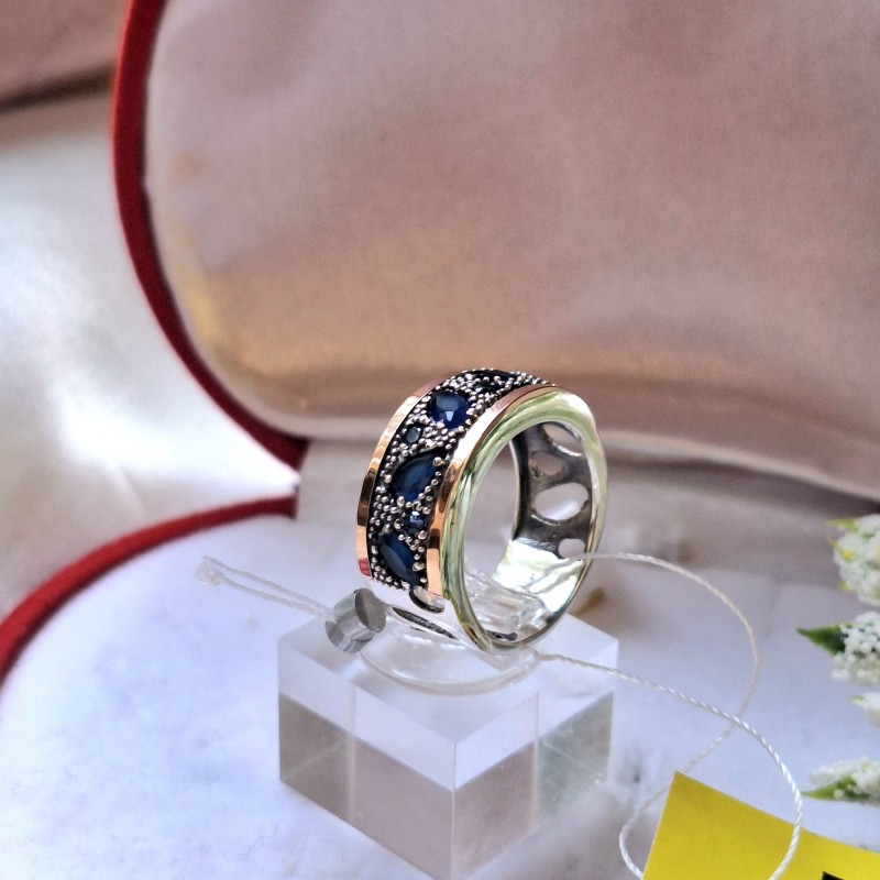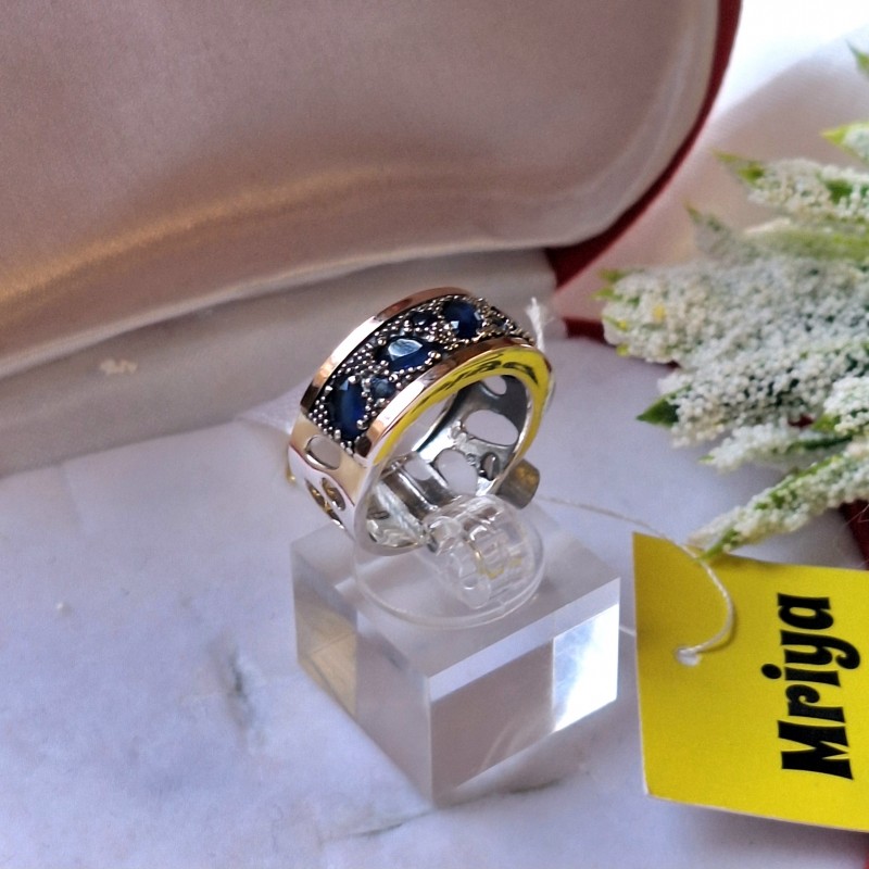 Silberring mit Gold, Zirkonia, Alpanit. Oxidiertes 925er Sterlingsilber und 375er Gold. Zarter und romantischer Silberring mit Gold, Alpanit und Zirkonia. Silber mit Goldeinsatz sieht im Vergleich zu klassischem Silber sehr reichhaltig und stilvoll aus. Seine Brillanz und Schönheit werden Ihr Bild wunderbar bereichern. Eine Dame mit solchem Schmuck wird stilvoll und raffiniert aussehen.