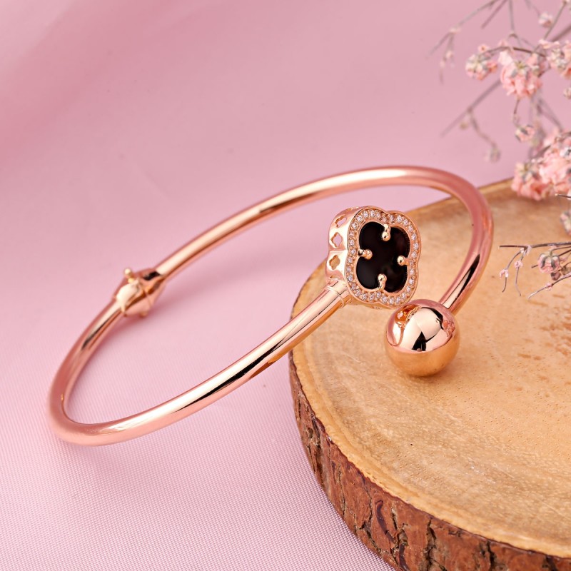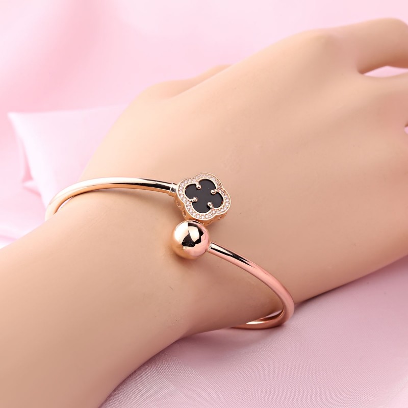 Rotgold mit wunderschönen Zirkonia, schwarzen Onyx und Goldkugel mit Spiegeloberfläche. Das Armband lässt sich sehr bequem an- und ausziehen. Dieses Produkt ist ein Modetrend und ein Statusaccessoire. Dekorieren Sie anmutige Frauenhände perfekt!