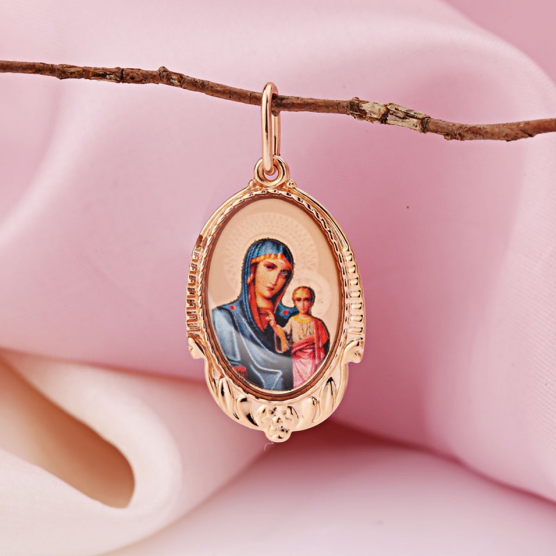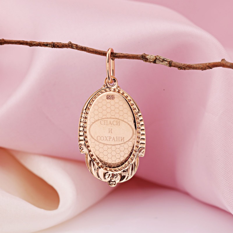 Goldikone Ikonenanhänger aus 14 Karat rotem russischem Gold mit farblosen Emaille. Oben am Anhänger befindet sich ein Kettenring.