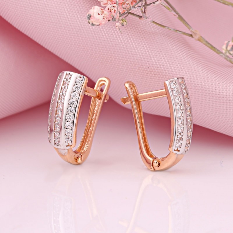 Rotgold 585 mit Weißgoldakzenten und Zirkonia. Die ideale Abrundung des Bildes einer stilvollen Frau, die gerne ihr Aussehen verändert, sind Ohrringe mit Zirkonia aus 585er