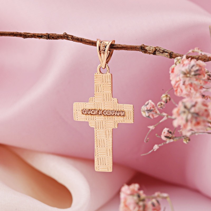 Rotgold. Auf der Rüchseite ist Inschrift auf Russisch eingraviert: "Rette und bewahre". Das Kreuz kratzt nicht beim Tragen.