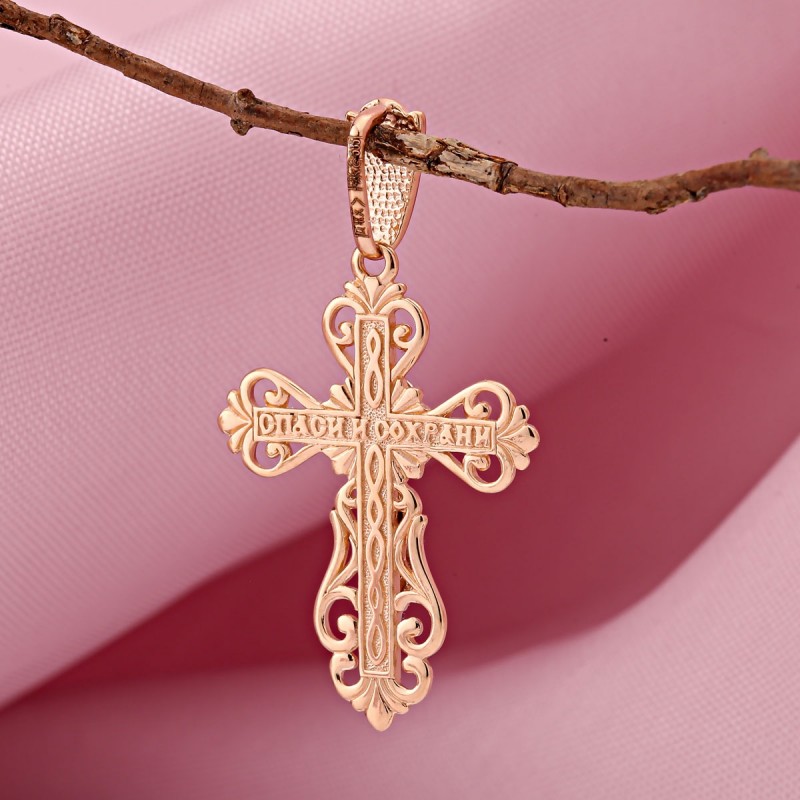 Russisches Gold 585 in Deutschland Kreuzanhänger mit einem Kruzifix aus 585er Weiß/Rotgold. Die Christusfigur besteht aus Weißgold. Auf der Rückseite des Kreuzes ist ein Schutzgebet „Rettet und bewahrt“ eingraviert. Oben am Kreuz befindet sich ein Ring für eine Kordel oder Kette. Kratzt nicht beim Tragen.