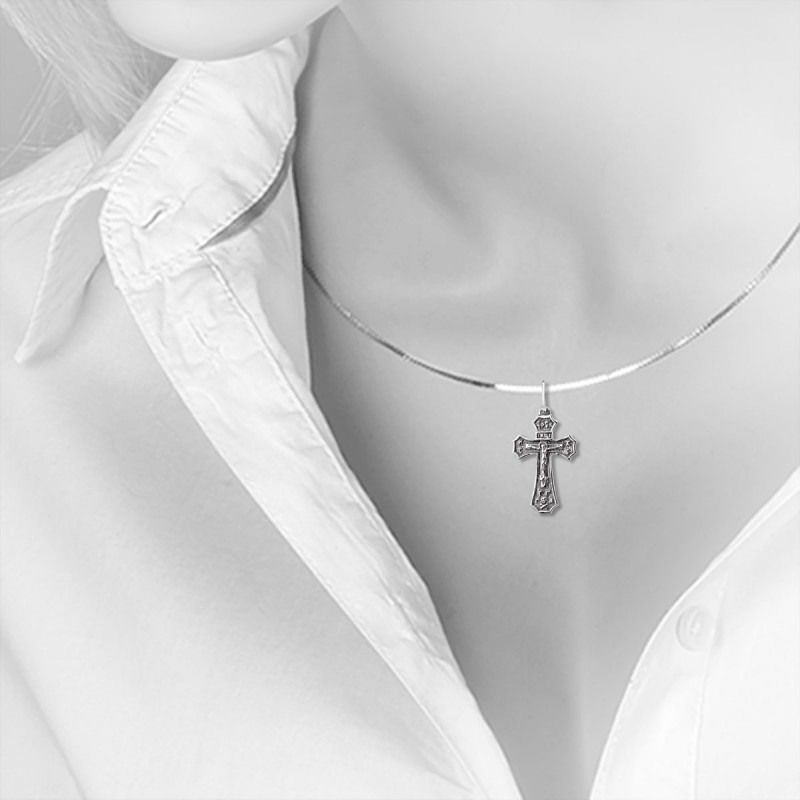 Silbernes Brustkreuz mit einem Kruzifix aus geschwärztem 925er Sterlingsilber! Auf der Rückseite befindet sich die Inschrift auf Russisch: „Rette und bewahre.“ Kratzt beim Tragen nicht.