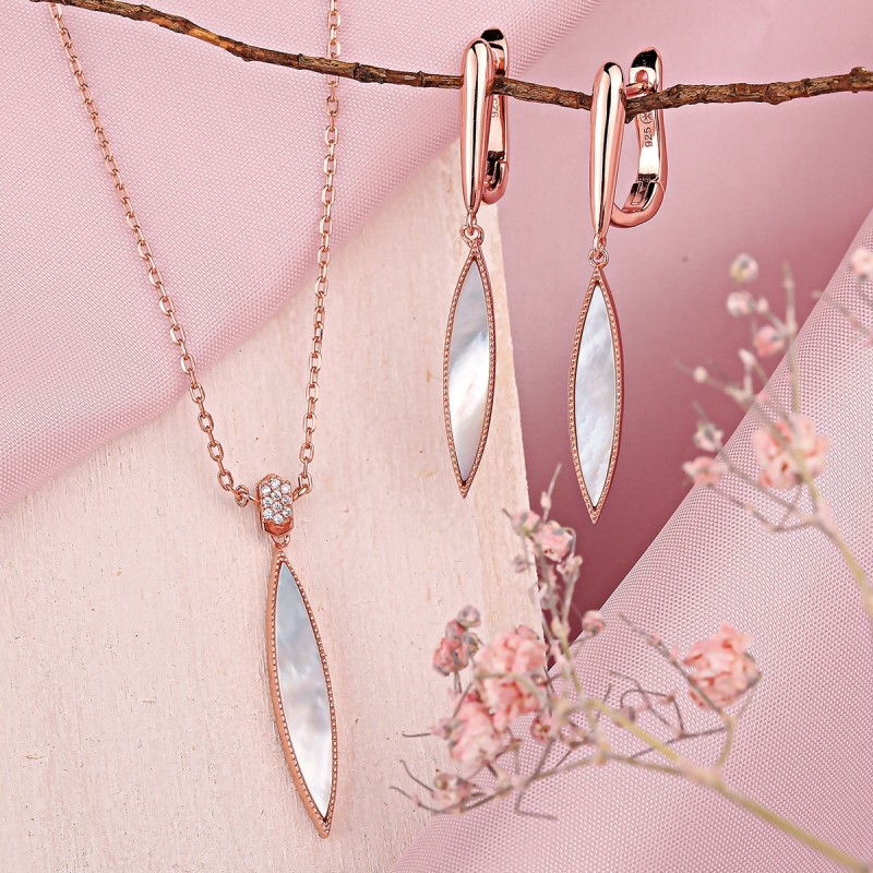Ein zauberhaftes, filigranes Schmuckstück: schimmerndes Perlmutt und funkelnde Zirkonias in einer eleganten Fassung aus rotvergoldetem 925er Sterlingsilber. Im Set enthalten: Ankerkette mit Diamantschliff für zusätzlichen Glanz.
