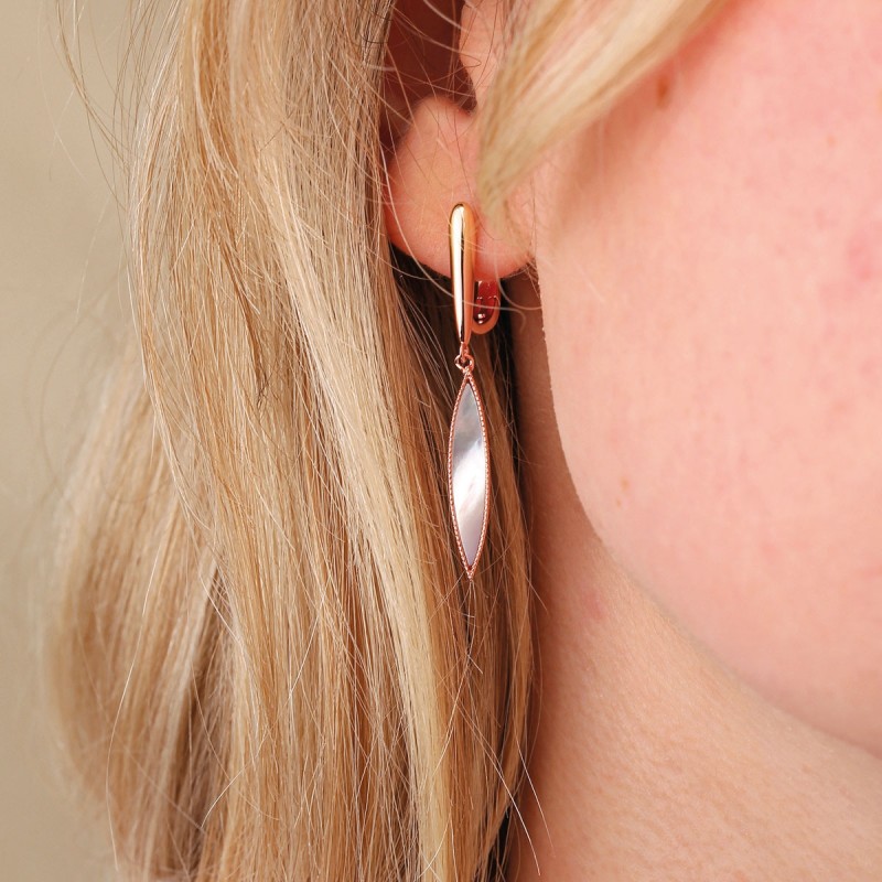 Vergoldete Ohrringe hängend. Faszinierende Ohrhänger aus rotvergoldetem 925er Sterlingsilber mit schimmerndem Perlmutt