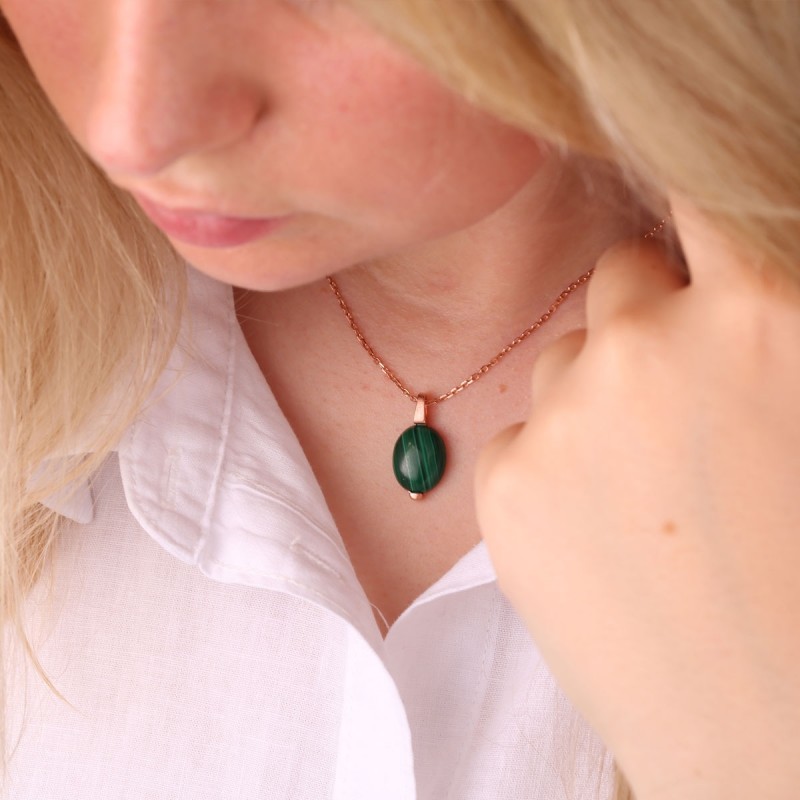 Vergoldetes Silber in Deutschland. Vergoldeter Anhänger mit Malachit. Ein entzückender, zarter Anhänger aus 925er Sterlingsilber mit Vergoldung, besetzt mit einem großen, einzigartigen Malachit in einer eleganten Fassung. Jede Steinintarsie ist unverwechselbar in Farbe und Muster. Inklusive Ankerkette mit Diamantschliff.