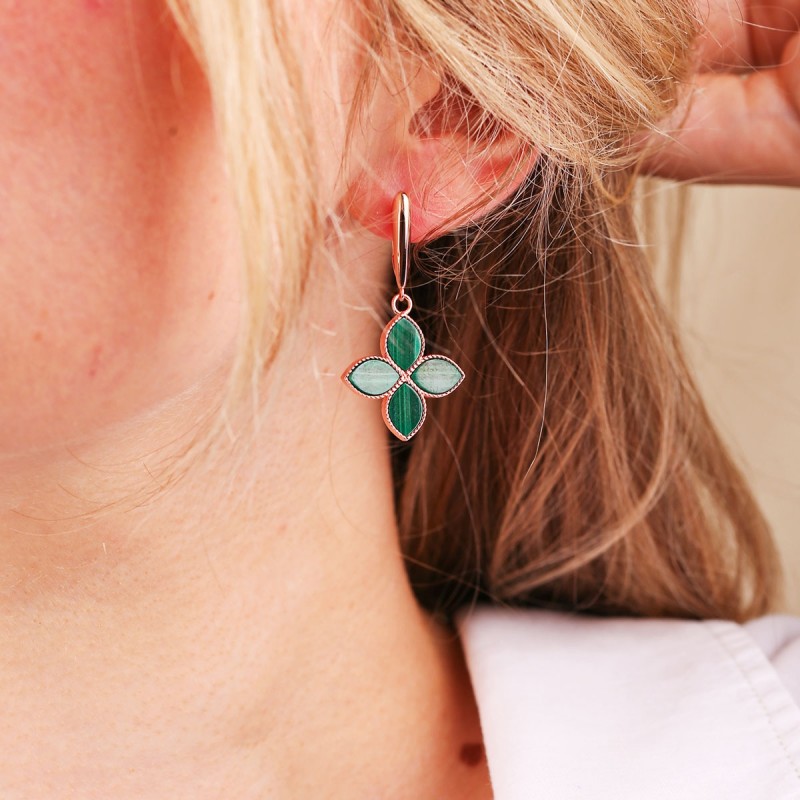 Vergoldete Ohrringe hängend. Wunderschöne Ohrhänger aus rotvergoldetem Silber 925 Probe, mit bezaubernden Malachit! Eine einzigartige Gelegenheit, Ihre Individualität zu betonen, das Bild von Weiblichkeit, Sonnenschein und Zärtlichkeit zu vermitteln.