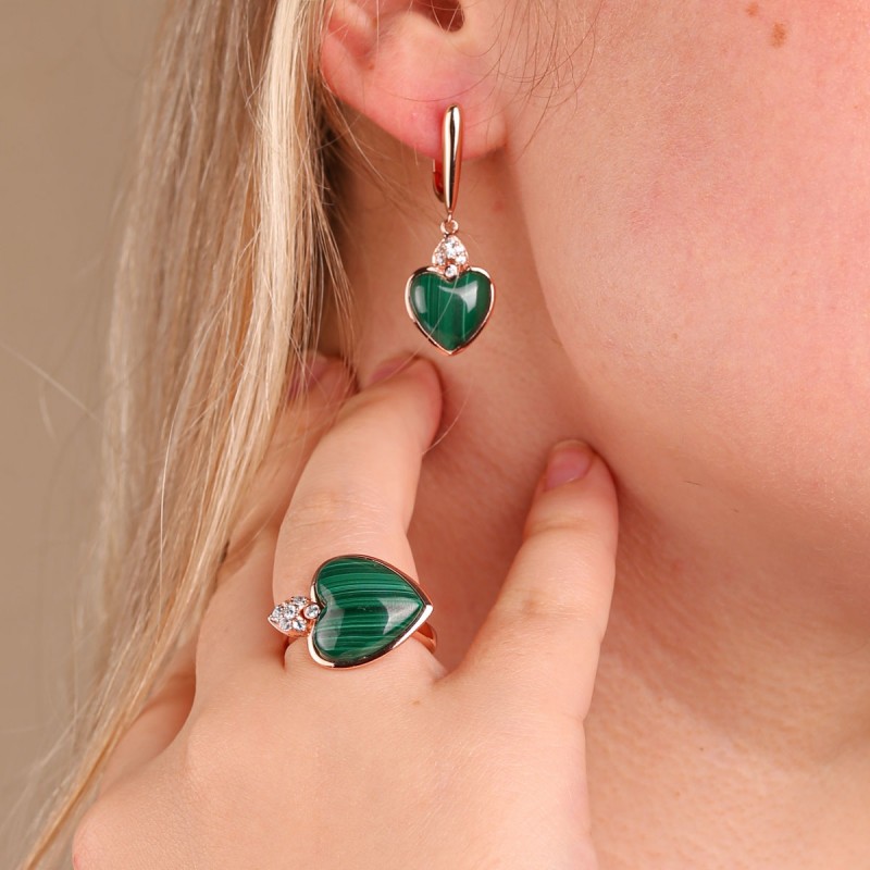 Vergoldete Silberohrhänger 925º mit Malachit Zirkonia in Deutschland kaufen. Wunderschöne Ohrhänger aus rotvergoldetem Silber 925 Probe, mit bezaubernden Malachit und funkelnden Zirkonia! Eine einzigartige Gelegenheit, Ihre Individualität zu betonen, das Bild von Weiblichkeit, Sonnenschein und Zärtlichkeit zu vermitteln.
