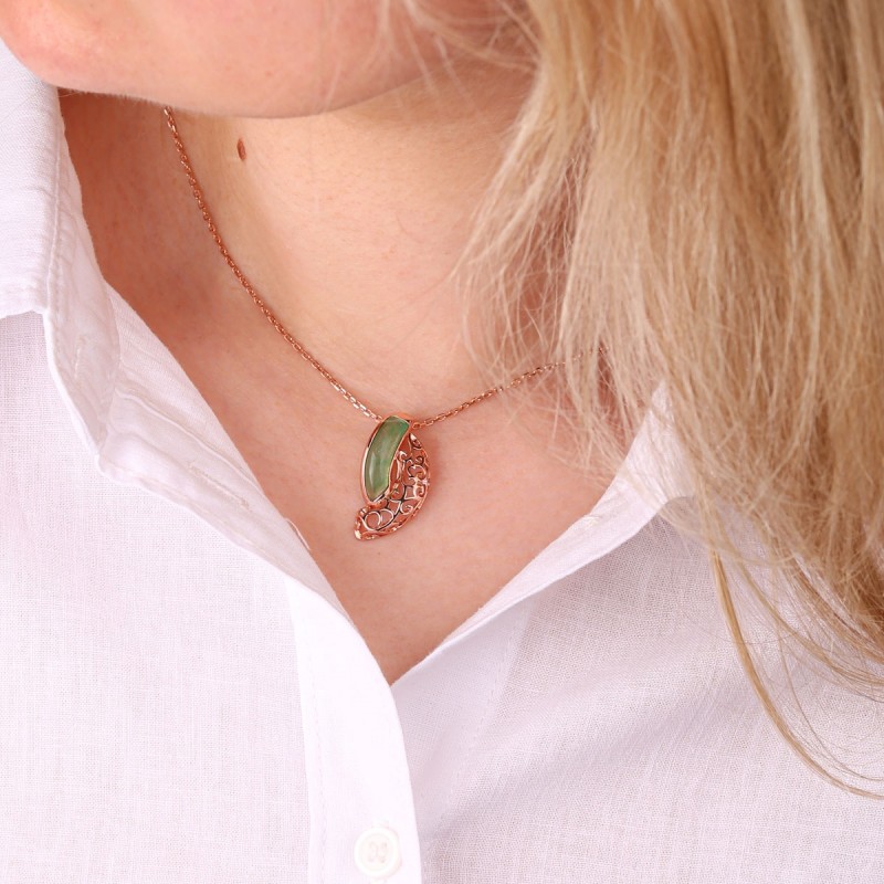 Der Anhänger besticht durch die natürliche, intensive Farbe des Jade-Steins in einer eleganten Fassung. Die Kette mit Ankergeflecht und Diamantschliff ist im Set enthalten und verleiht zusätzlichen Glanz.
