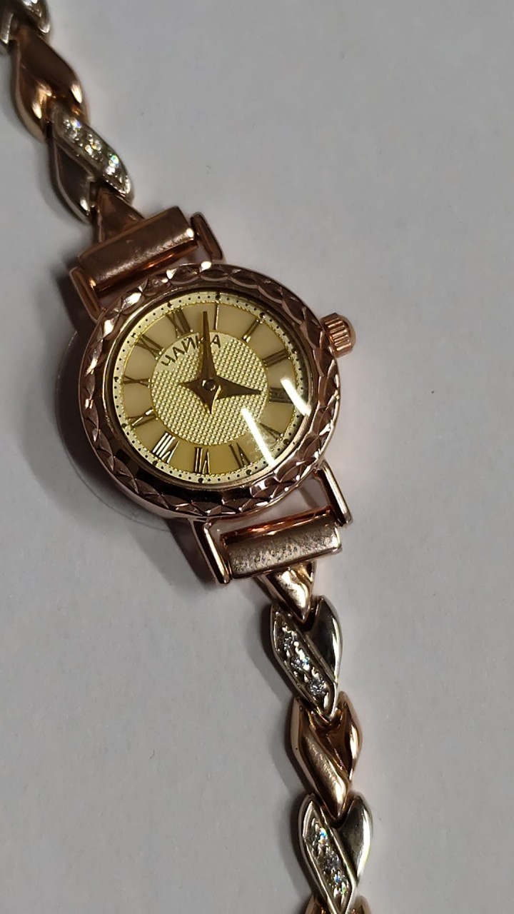 Golduhr Chaika Damenuhr aus 585 Gold. Elegante Damenuhr aus Gold 585° mit Zirkonia am Armband. Solche Marken, die auf dem Territorium der UdSSR gefragt sind, wie Chaika-Uhren, sind heute wieder beliebt. Nur wenige Menschen wissen, dass die sowjetische Uhr bei internationalen Wettbewerben zusammen mit Rolex- und Swiss Marken die ersten Plätze einnahm.