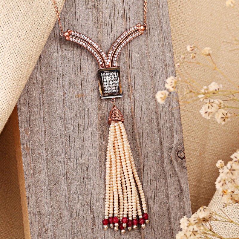 Silberkette 925 im orientalischen Stil mit Perle, Rubin Korund und Zirkonia