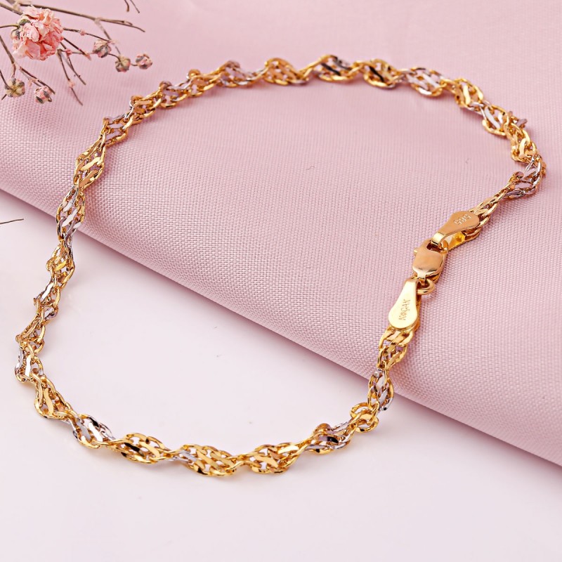 Плетение «Сингапур» отличается особой изящностью: звенья образуют мягкий волнообразный рисунок, который красиво переливается на свету и придаёт браслету динамику и воздушность.