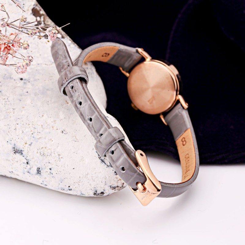 Das Gehäuse aus 585er Rotgold verleiht der Uhr eine exklusive und elegante Ausstrahlung. Das graue Zifferblatt mit klaren arabischen Ziffern und goldfarbenen Zeigern sorgt für beste Ablesbarkeit, während die fein gearbeitete, reliefierte Lünette zusätzlichen Charme bringt. Ein graues Lederarmband aus echtem Leder garantiert hohen Tragekomfort im Alltag.