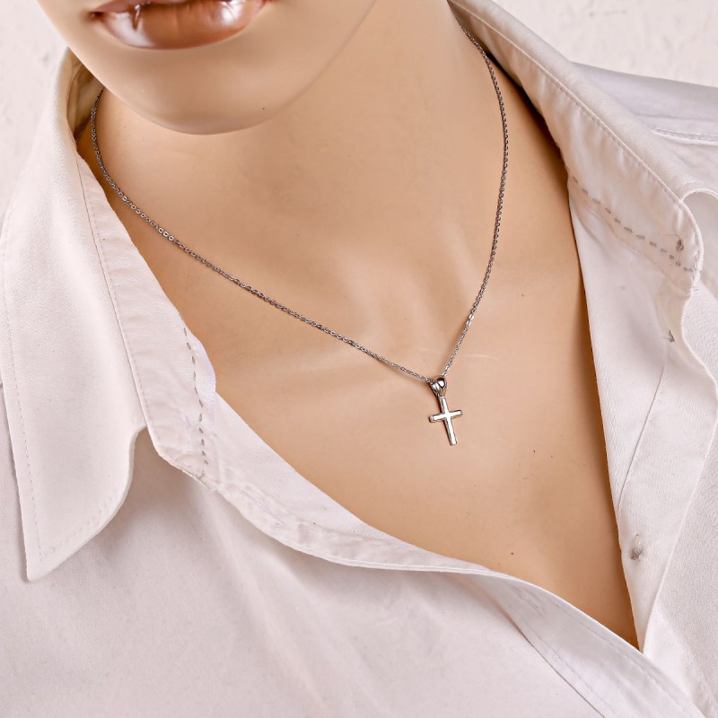 Silberkette mit Kreuzanhänger aus 925er Silber. Das Kreuz ohne Korpus ist aus Sterlingsilber gefertigt und mit einer Ankerkette mit Diamantschliff kombiniert.