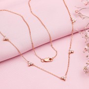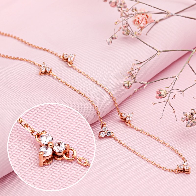 Rotgold schmiegt sich sanft an den Hals und verleiht dem Schmuckstück eine leichte, harmonische Ausstrahlung. Kleine Zirkonia-Elemente sind rhythmisch entlang der Kette angeordnet und sorgen für ein dezentes Funkeln bei jeder Bewegung.