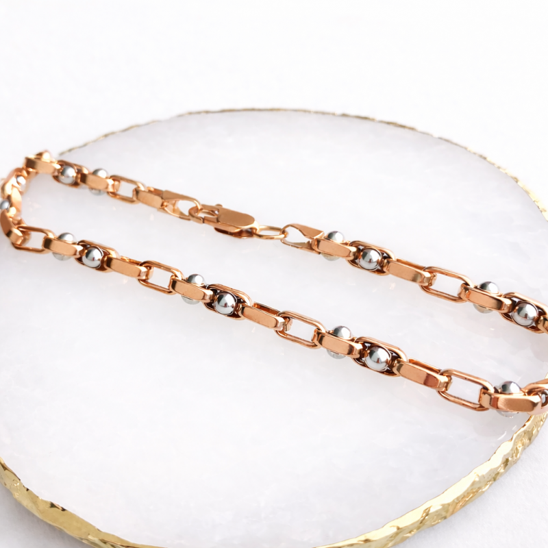 красного золота гармонично сочетается с холодным блеском белых акцентов, подчёркивая геометрию звеньев и придавая браслету современный, утончённый характер. Украшение выглядит стильно и уверенно, оставаясь элегантным и универсальным — оно органично впишется как в повседневный образ, так и в более статусные сочетания.