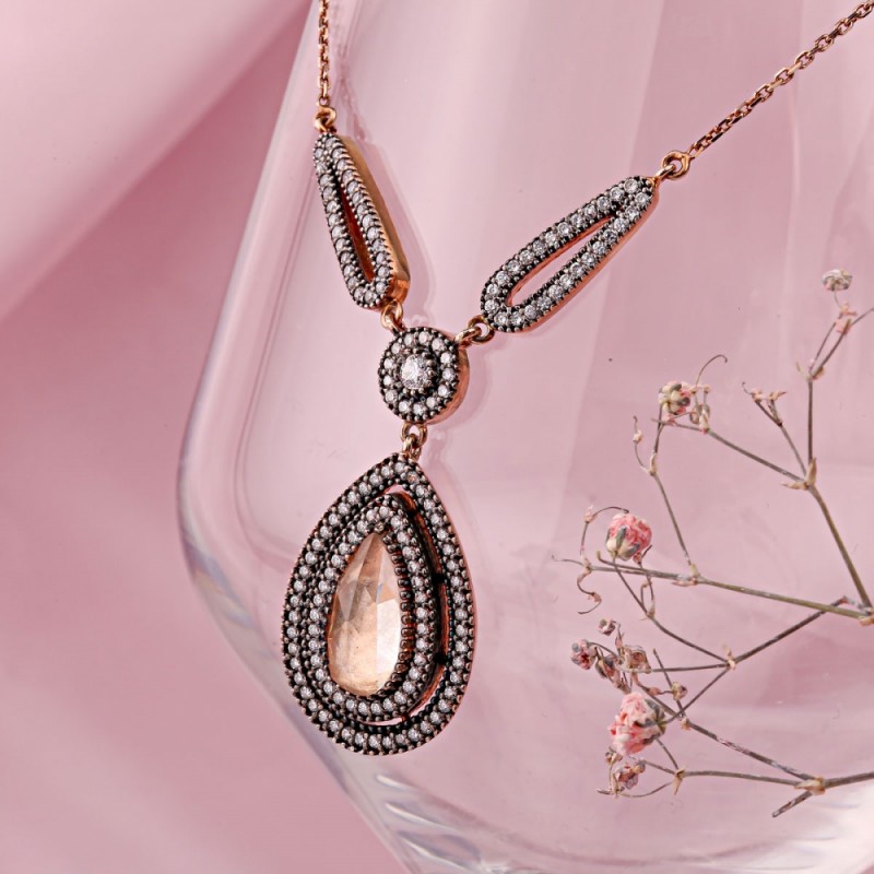 Zirkonia bilden einen strahlenden Rahmen rund um den Mittelstein sowie die dekorativen Verbindungselemente. Dadurch entsteht ein mehrschichtiger Glanzeffekt mit besonderer Ausdruckskraft.