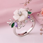 Silberring 925 Perlmutt. Eleganter Ring aus 925er Silber mit Perlmutt, Zirkonia und grüner Emaille im floralen Design. Das zentrale Element bildet eine Blüte aus natürlichem Perlmutt, deren Blütenblätter sanft im Licht schimmern und dem Schmuckstück eine besonders edle Ausstrahlung verleihen.