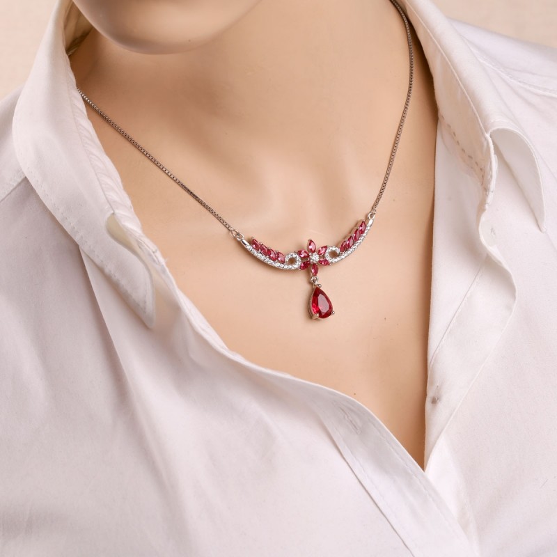 Geschwungene Linien sind mit weißen Zirkonia besetzt und sorgen für ein feines Funkeln. Ein beweglicher Anhänger mit einem tropfenförmigen rubinroten Zirkonia rundet das Design ab und verleiht dem Collier zusätzliche Eleganz und Bewegung.
