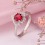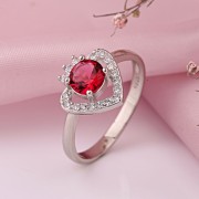 Der Stein liegt im Zentrum einer eleganten herzförmigen Fassung, die mit zahlreichen weißen Zirkonia besetzt ist. Ihr feines Funkeln bildet einen leuchtenden Rahmen um den roten Stein und verstärkt seine intensive Ausstrahlung.