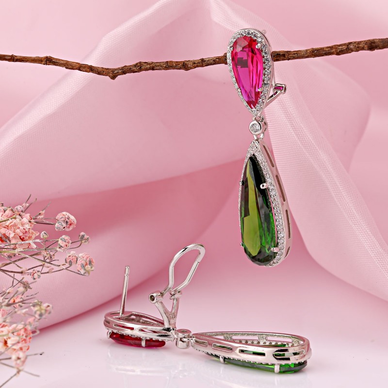Der obere Teil der Ohrringe wird von leuchtenden rubinfarbenen Zirkonia (14 × 6 mm) geprägt, die von einem funkelnden Rahmen aus weißen Zirkonia umgeben sind. Darunter folgen die großen grünen Zirkonia (22 × 8 mm) in eleganter Tropfenform, die dem Schmuckstück eine besonders edle und ausdrucksstarke Ausstrahlung verleihen.