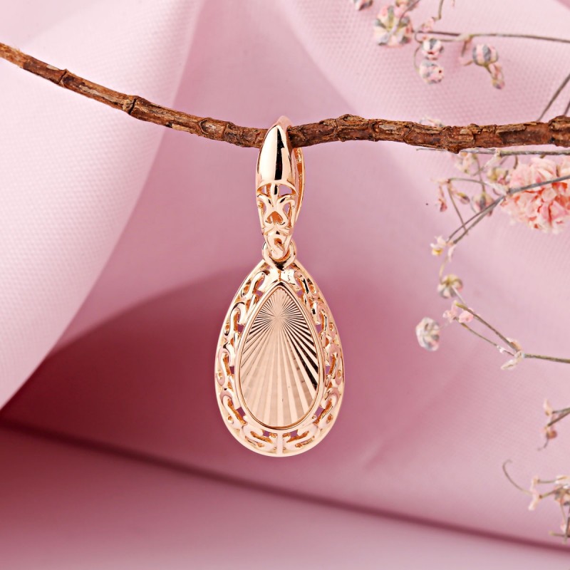 Rotgold 585 in eleganter Tropfenform mit filigranem Durchbruchmuster und diamantierter Oberfläche. Die längliche Silhouette streckt optisch den Hals und sorgt für eine schlanke, feminine Linie. Das zentral gravierte Element mit Strahlenstruktur reflektiert das Licht intensiv und verleiht dem Schmuckstück einen starken Glanzeffekt.