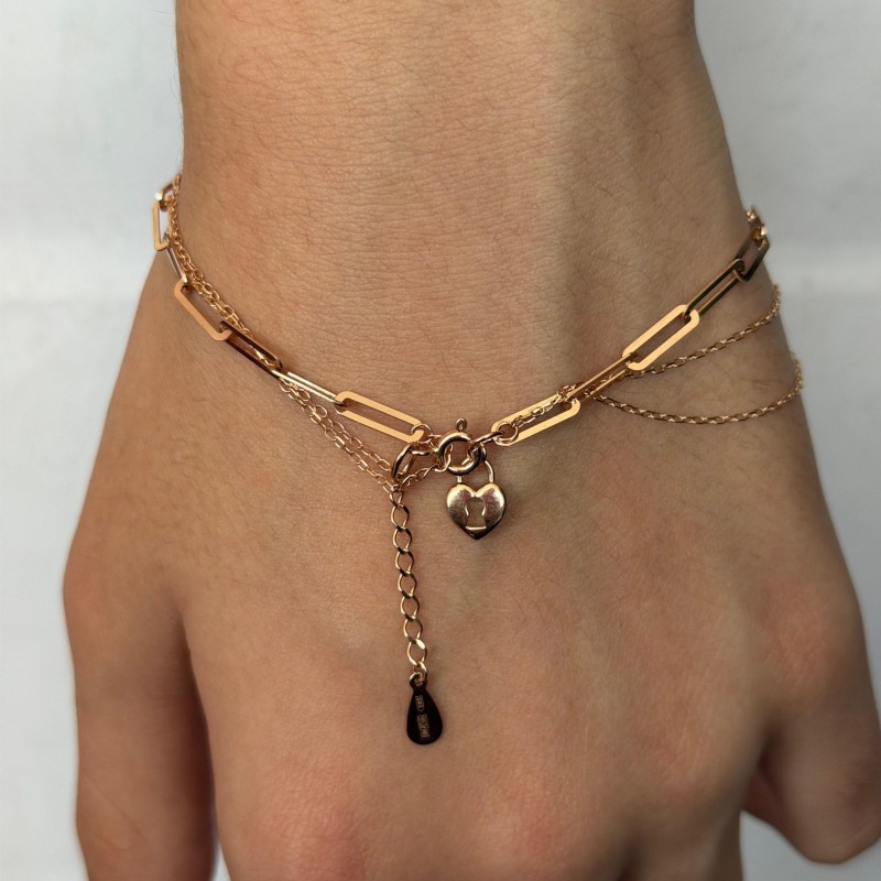 Rotgold 585 — ein vielseitiges 2-in-1 Schmuckstück, das sowohl als elegante Halskette als auch als stilvolles Armband getragen werden kann. Die Kombination aus geometrischer Gliederkette und feiner Kette erzeugt einen eleganten Layering-Effekt in einem einzigen Schmuckstück.