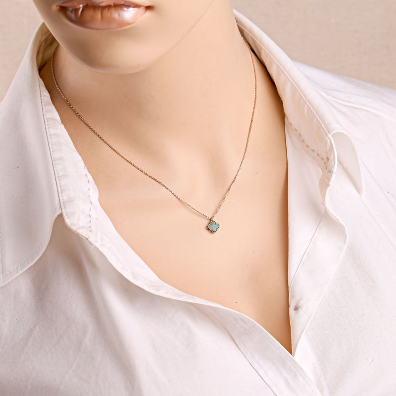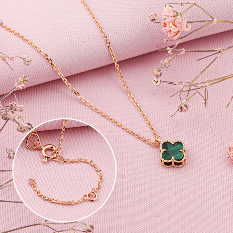 Das vierblättrige Element wirkt klar und harmonisch, während der Malachit dem Schmuck Charakter verleiht. Seine feinen Strukturen und Farbverläufe machen jedes Stück optisch einzigartig. In Kombination mit warmem