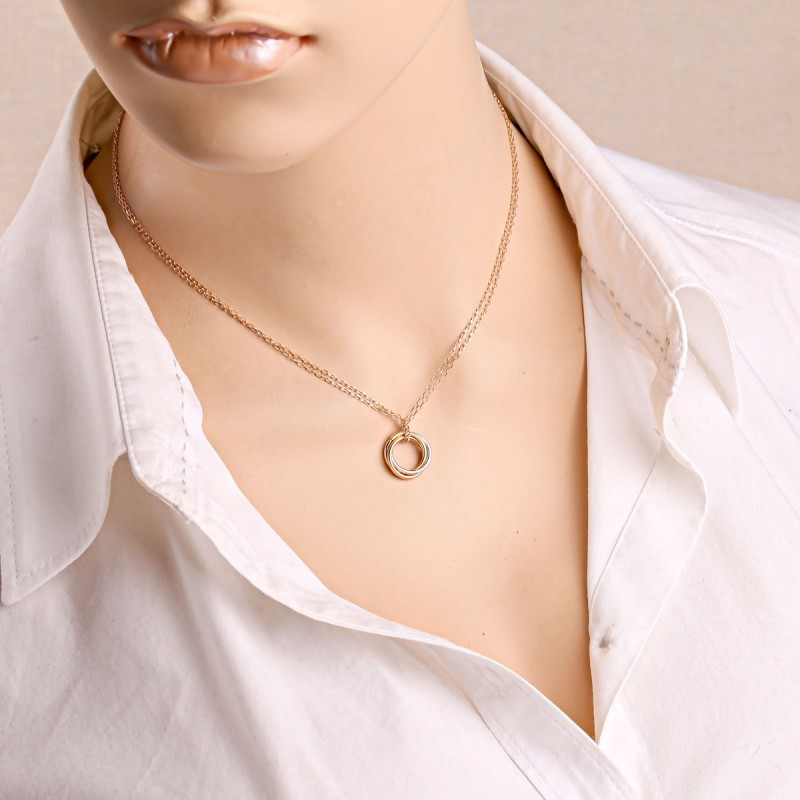 Rotgold 585 mit dekorativem Anhänger aus drei Goldfarben — eine elegante Komposition, die von Farbspiel und fließenden Formen lebt. Die ineinanderliegenden Ringe aus Weiß-, Gelb- und