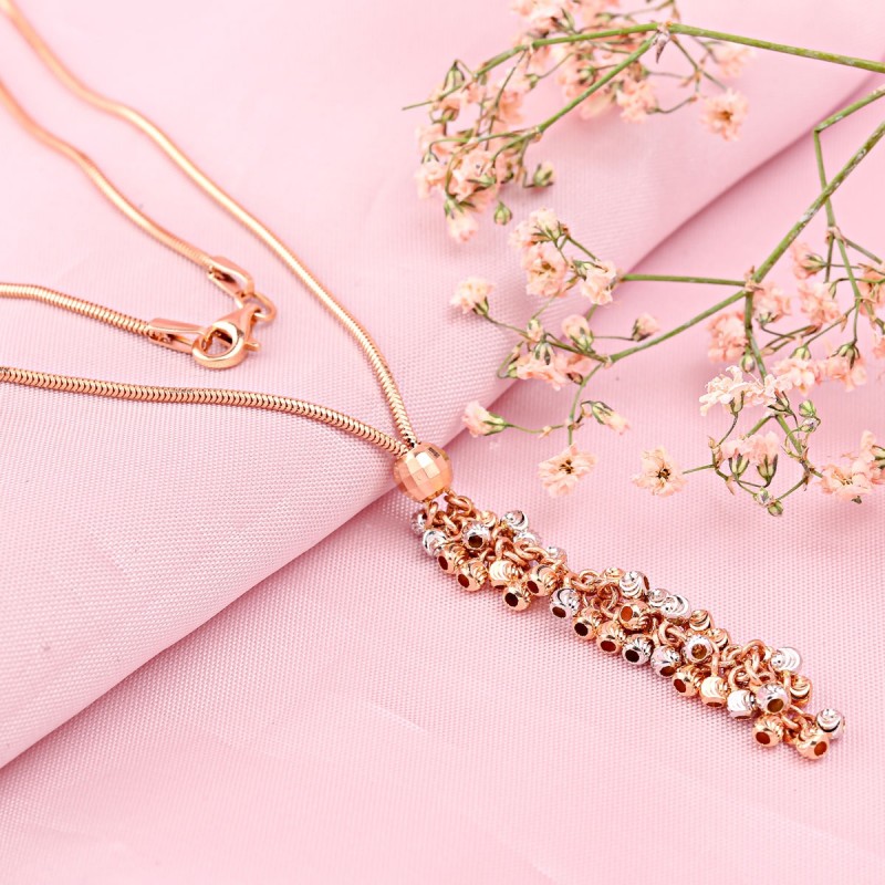 Rotgold mit beweglicher Anhängerkomposition, die wie ein fließender Lichtstrahl wirkt. Die filigrane Kaskade aus kleinen Kugeln erzeugt ein lebendiges Funkeln bei jeder Bewegung.