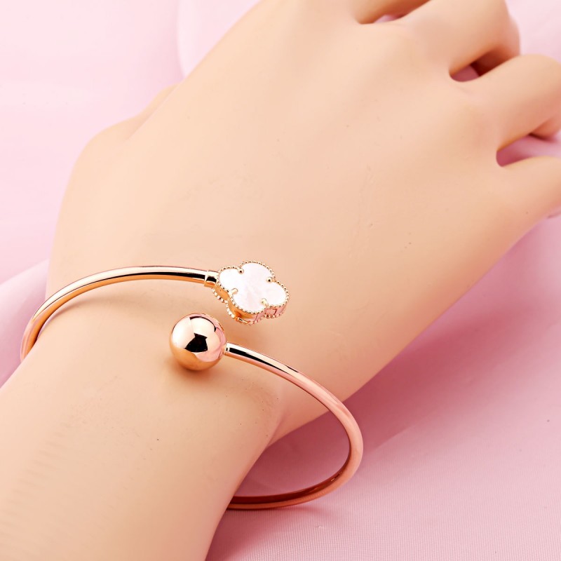 Rotgold mit einem dekorativen Element in Form eines vierblättrigen Kleeblatts. Die klare, runde Form umschließt das Handgelenk sanft und wirkt ausgewogen und stilvoll.