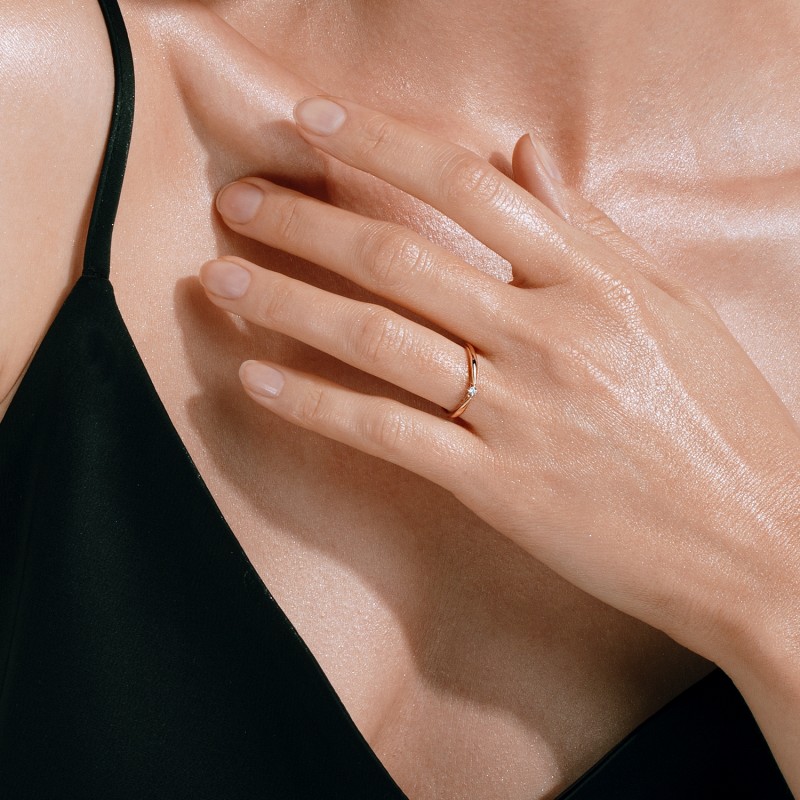 Rotgold mit einer dezenten Zirkonia-Einlage — ein Ausdruck von purer Eleganz und klarer Formensprache. Der zentral gefasste Stein setzt einen feinen Lichtpunkt und sorgt für ein sanftes Funkeln bei jeder Bewegung.