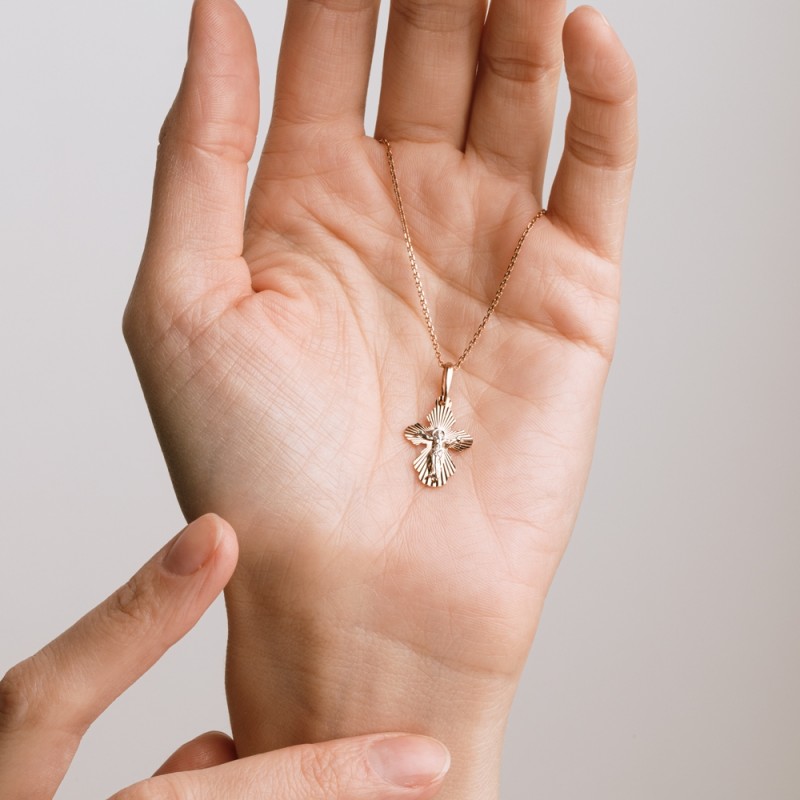 Rotgold und weißem Rhodium hebt das Kruzifix hervor.
