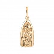 Rotgold 585 mit Darstellung der Gottesmutter mit Kind. Der Anhänger hat längliche Form mit glatten, polierten Rändern und reliefierter Mitte. Auf der Rückseite befindet sich eine kyrillische Gravur der Gebetsworte.