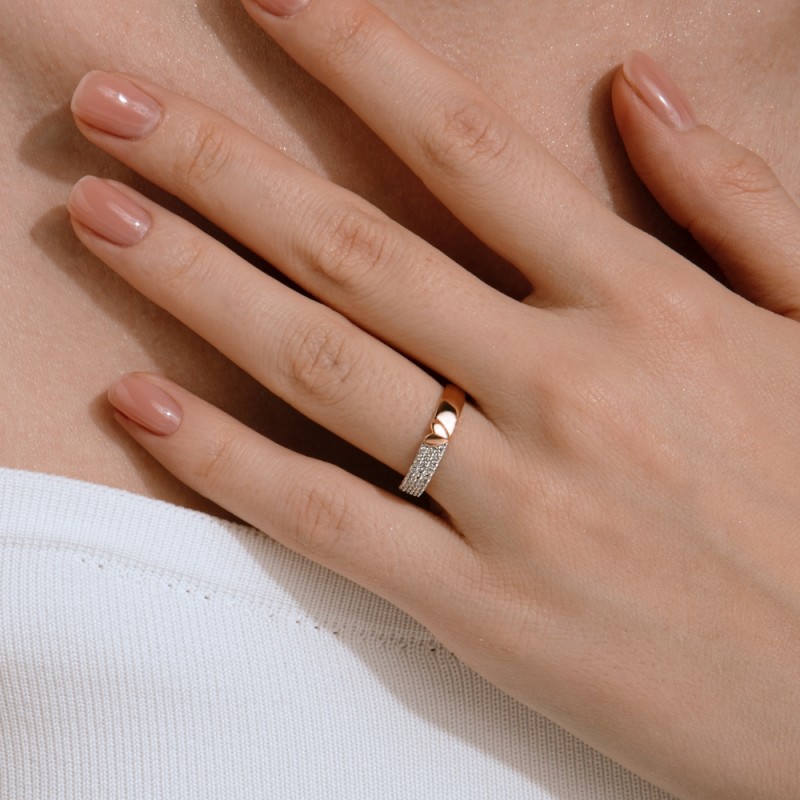 фианитов мягко переливается, создавая эффект живого света, который подчёркивает плавные линии кольца. Контраст тёплого золота и холодного блеска камней делает образ утончённым и притягательным.