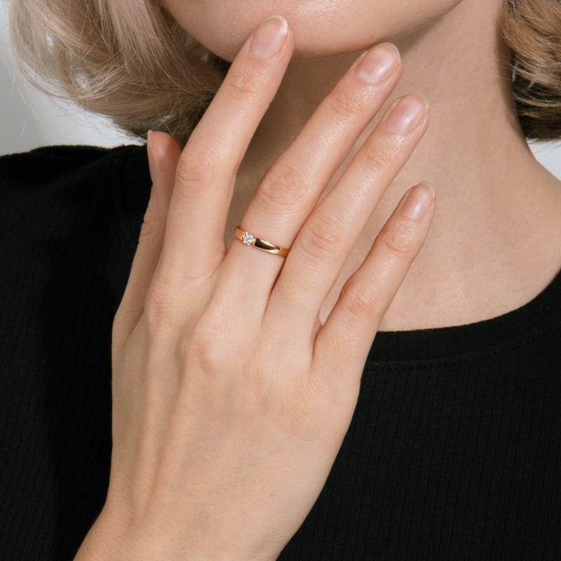 красного золота — воплощение тонкой элегантности и сдержанного сияния. Центральный элемент, словно миниатюрный цветок из света, мягко раскрывается на поверхности кольца, создавая ощущение хрупкой гармонии.