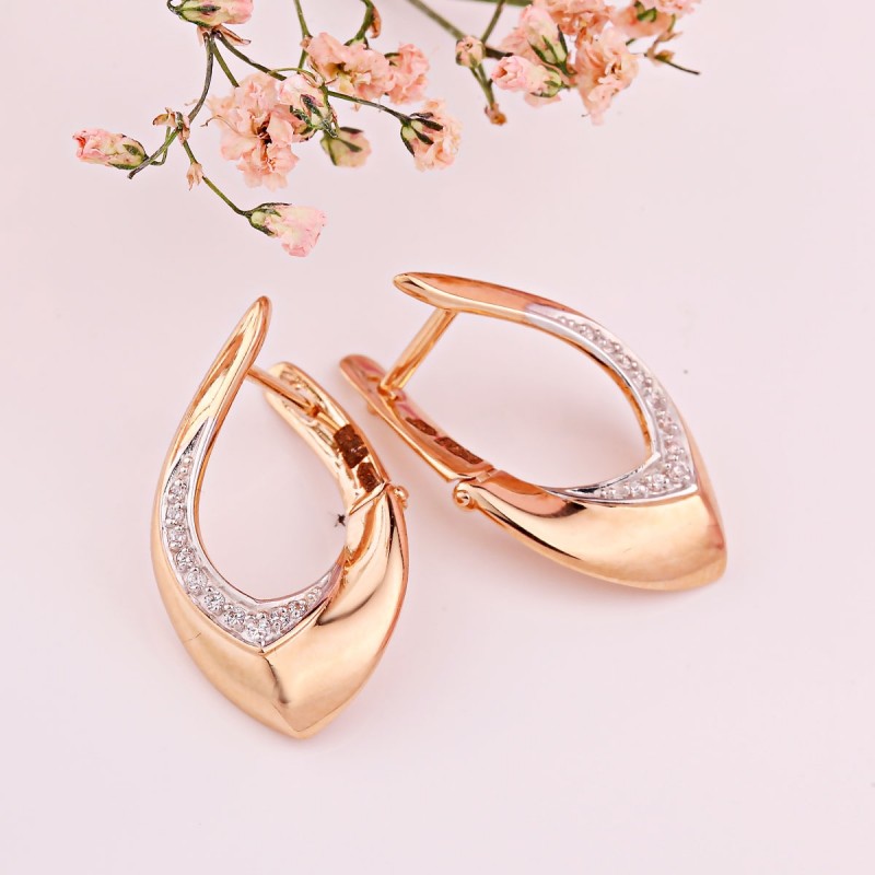 Красное золото 585 пробы отличается тёплым, благородным оттенком и высокой прочностью. Частичное родирование добавляет контраст и подчёркивает сияние вставок, усиливая визуальную глубину украшения. Такое сочетание делает серьги выразительными и долговечными.