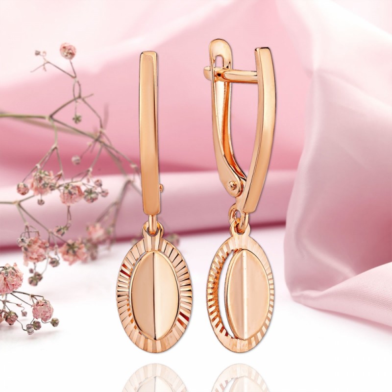 Купить золотые серьги 585. Эти серьги подвески из красного золота — про сдержанную элегантность, где каждая деталь работает на ощущение гармонии. Гладкая, зеркальная поверхность красного золота мягко контрастирует с тонкой лучевой огранкой по краю подвески, создавая деликатную игру света.