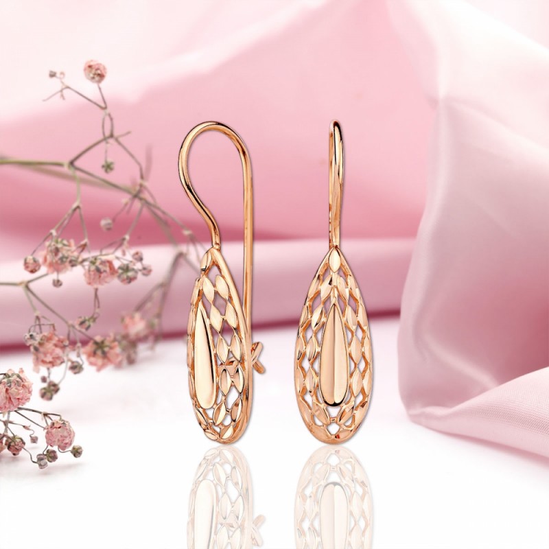 Ohrringe Russisches Gold 585. Diese Ohrringe wirken wie feine goldene Spitze — luftig, leicht und voller Licht. Die filigrane, durchbrochene Struktur erinnert an zartes Musterwerk, während das glatte, tropfenförmige Element im Inneren einen edlen, spiegelnden Akzent setzt.