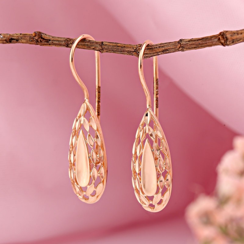 Купить золотые серьги в Германии. Эти серьги из красного золота словно сотканы из света и воздуха — изящная ажурная форма напоминает тонкое золотое кружево, в котором каждая линия играет бликами при малейшем движении. В центре — гладкий каплевидный элемент с зеркальным блеском, создающий красивый контраст с лёгкой, почти невесомой текстурой внешнего контура.