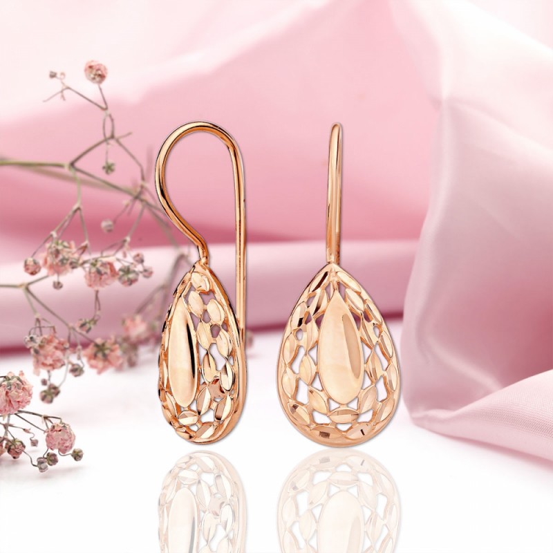 Rotgold spielt mit dem Licht und durchzieht die offenen Strukturen, wodurch ein lebendiger, dennoch zarter Effekt entsteht. Die Tropfenform streckt optisch und unterstreicht die natürliche Eleganz.
