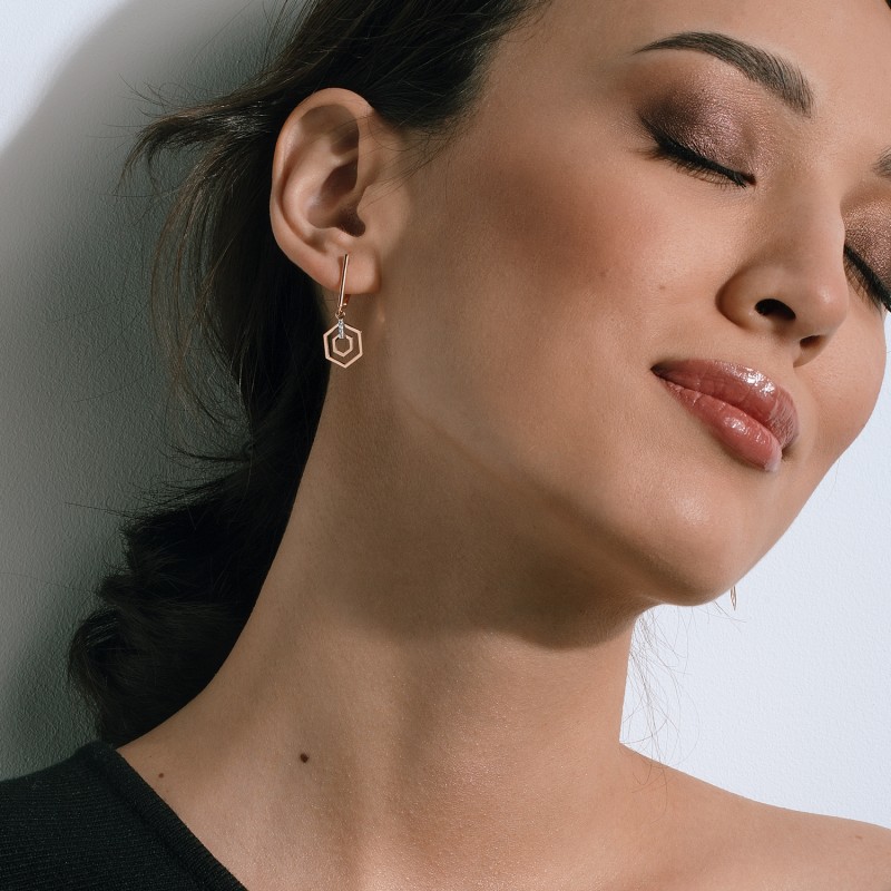 Goldohrringe hängend 585 kaufen. Diese Ohrringe leben von klarer Geometrie. Zwei ineinander liegende Sechsecke erzeugen eine besondere Tiefenwirkung – die Form scheint sich nach innen zu bewegen und verleiht dem Design Dynamik.