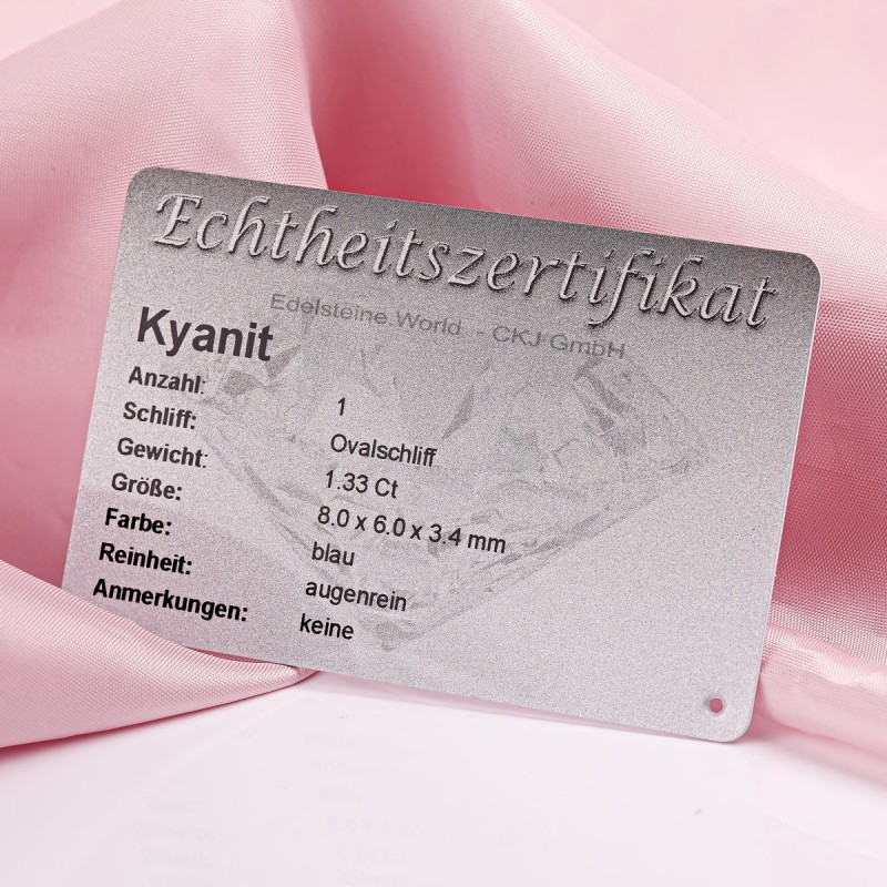 Ein besonderes Highlight ist das Echtheitszertifikat, das die Eigenschaften des Kyanits bestätigt — einschließlich Gewicht, Größe, Schliff und Reinheit. Dies garantiert geprüfte Qualität und verleiht dem Schmuckstück zusätzliche Wertigkeit.