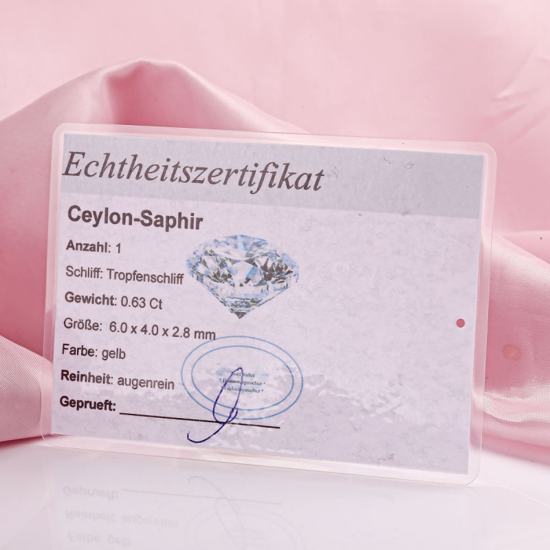 Ein besonderes Highlight ist das Echtheitszertifikat, das die Herkunft des Saphirs (Ceylon) sowie seine Eigenschaften — Gewicht, Größe, Schliff und Reinheit — bestätigt und die hohe Qualität des Schmuckstücks unterstreicht.