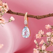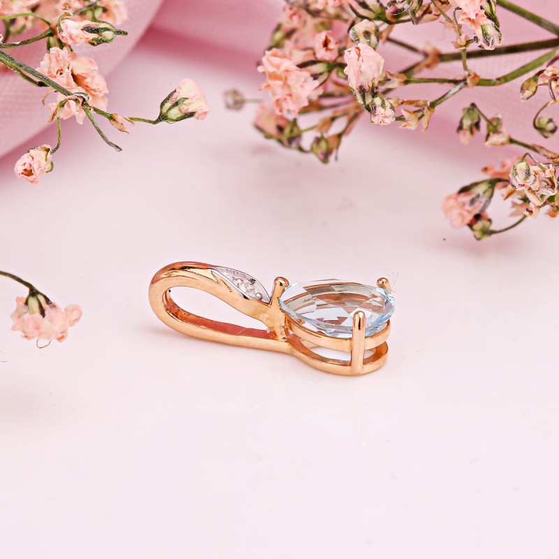 Голубой топаз в огранке «груша» раскрывается мягким, прозрачным сиянием, создавая ощущение свежести и света. Небольшой бриллиант в верхней части добавляет аккуратный акцент, делая композицию завершённой и гармоничной.