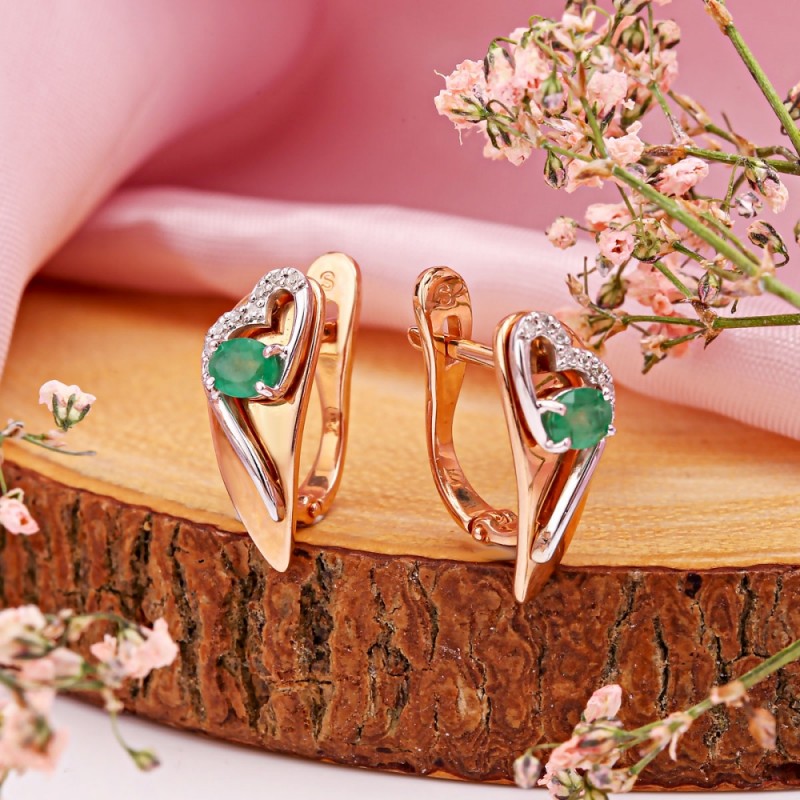 Красное золото 585 пробы отличается тёплым благородным оттенком и высокой износостойкостью. Изумруд ценится за насыщенный природный цвет и характерную глубину, а бриллианты добавляют утончённое мерцание, подчёркивая форму украшения.