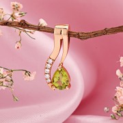 Красное золото 585 пробы отличается тёплым, насыщенным оттенком и высокой прочностью. Хризолит ценится за свежий природный цвет и лёгкую игру света, а бриллианты добавляют украшению аккуратное, живое сияние.