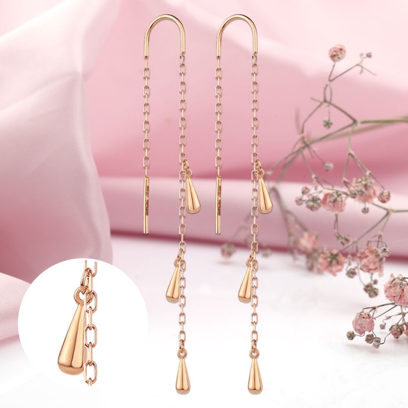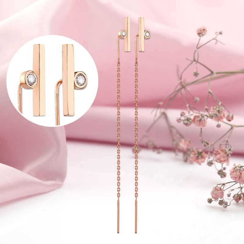 Goldene Ohrringe Durchzieher sind originelle Modelle, die sich durch das Fehlen eines Schlosses von traditionellen Ohrringen unterscheiden. Ihr Design umfasst eine lange hintere Kette und einen vorderen dekorativen Teil. Die Kette lässt sich dank der glatten Spitze leicht in die Punktion einfädeln.